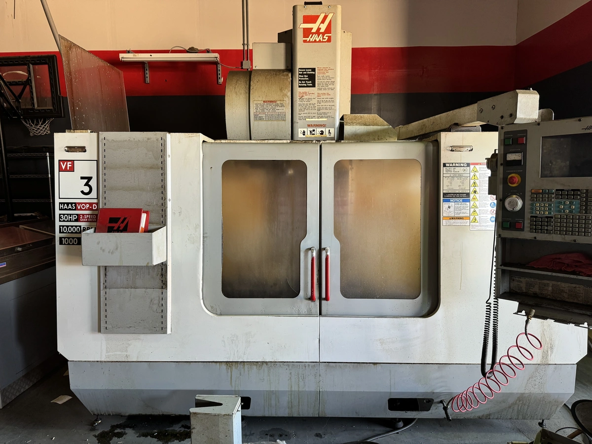 Explore HAAS VF-3 Vertical Machining Center, 2004. Features 40"x20"x25" travel, 30 hp, 10,000 RPM spindle, CT-40 taper, 24-tool ATC with Value Options Package-D. Includes manuals and leveling pads.